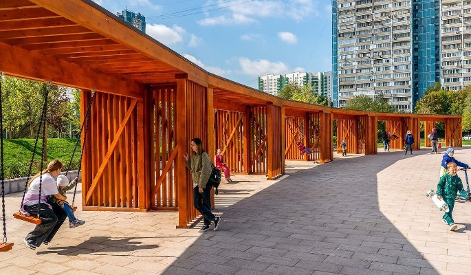 Эксперты Департамента капитального ремонта Москвы выбрали для строительства клееный брус – материал сочетает природную эстетику с повышенной износостойкостью. Даже в непогоду здесь можно наслаждаться свежим воздухом под надёжным навесом протяжённостью 50 метров!