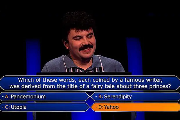 Оставшись с двумя подсказками, Беннетт сосредоточился на решающем вопросе: «Какое из четырёх слов, каждое из которых придумано прославленными писателями, появилось в сказке о трёх принцах?» Среди вариантов были: «пандемониум» (Pandemonium), «серендипити» (Serendipity), «утопия» (Utopia) и «еху» (Yahoo). В этот напряжённый момент Беннетт сначала решил спросить совета у знаменитого ведущего, а затем позвонил своей соседке по квартире, но правильный ответ остался для них загадкой.